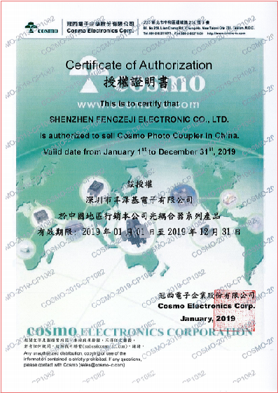 2015年4月1日起,“深圳市豐澤基電子有限公司”正式與“冠西電子企業(yè)股份有限公司”簽署正式代理商合約,己成為“冠西電子(COSMO)”授權(quán)“中國地區(qū)代理商”,致力于幫“冠西電子(COSMO)”在?電信(PC,電子記事本)?現(xiàn)代化設(shè)備?電話設(shè)備?安全設(shè)備?傳感器?測量和測試設(shè)備?工廠自動化設(shè)備?高速檢測機等行業(yè)推廣